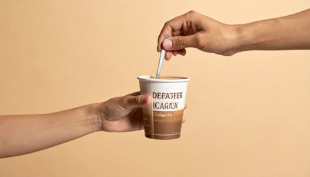 A simple, kind gesture captured as one person passes a freshly stirred takeaway coffee to another.