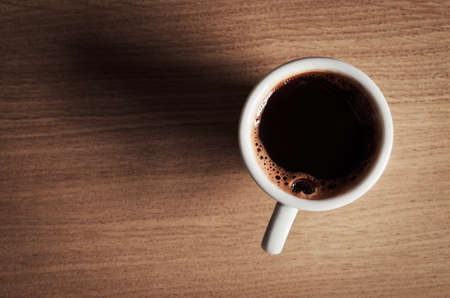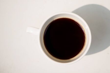 Close-up of white cup with fresh hot black coffee with bubbles on the surface in natural sunlight
