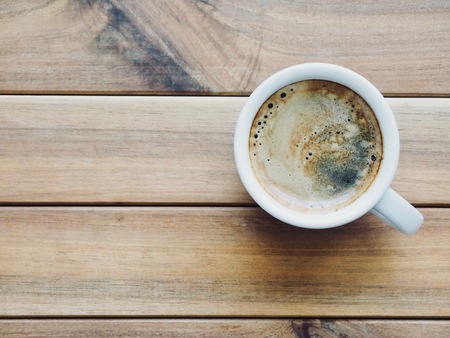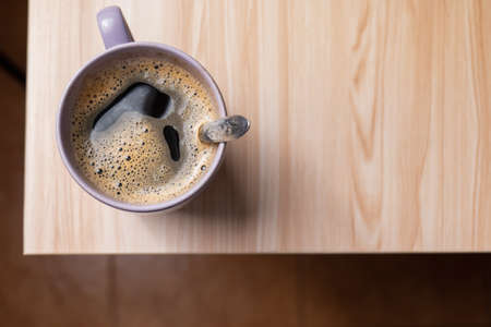 High angle shot of an old frothy coffee mug placed on the work table, ready to drink.