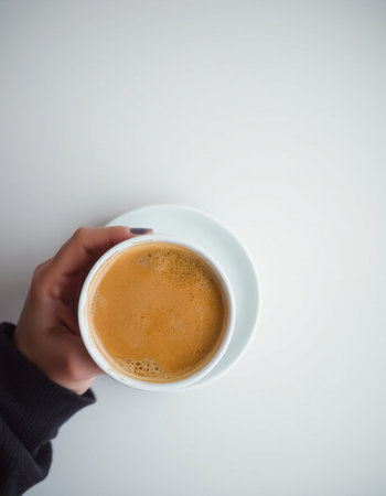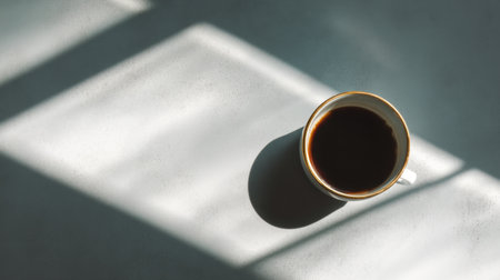 A serene aerial view of a steaming coffee cup resting on a light gray surface, accentuated by soft morning shadows. Ideal for tranquil moments.