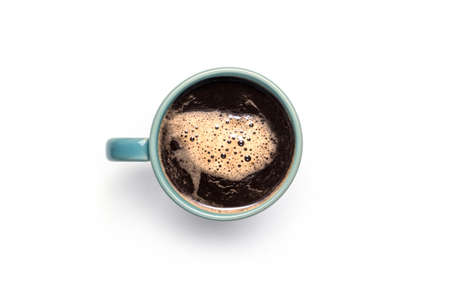 Small, white porcelain cup of black coffee set on a dark blue background. Top view, no people.