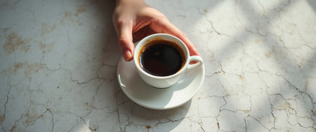 A delicate hand gently holds a steaming cup of rich black coffee, resting on a white saucer atop a beautifully cracked surface. The interplay of light and shadow creates a cozy atmosphere, inviting moments of reflection and warmth.