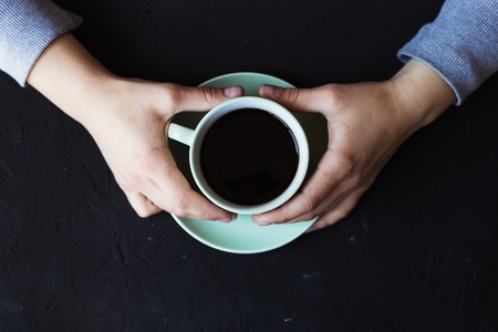 The girl hands holding hot cup of coffee. Hot coffee in the hands close-up