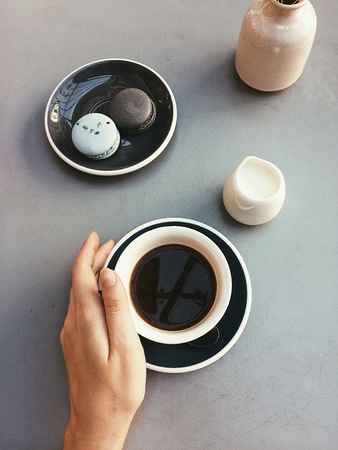 Woman romantic hand hold coffee drink in white cup and macaroons on a blue plate on a light table background. Top view