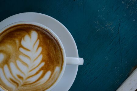 Cup of cappuccino with latte art on wooden background. Flat lay style.