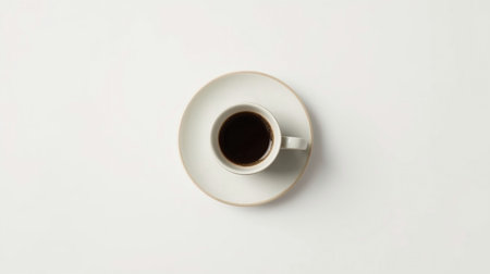 White cup of coffee on a saucer, on a white background, top view