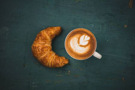 Top view of a latte and croissant on a dark retro tabletop, styled with warm lighting and vintage ambiance.