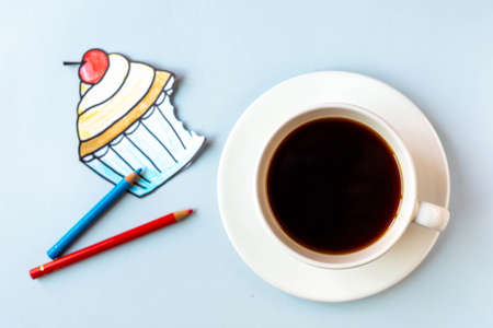 A white cup of black coffee and a cupcake drawn with colored pencils in out of focus are placed on a blue background. The topic of diet and the rejection of sweet pastries.