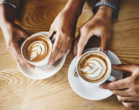 Human feelings. Frothy cappuccino between two hands. Friendship pastime.
