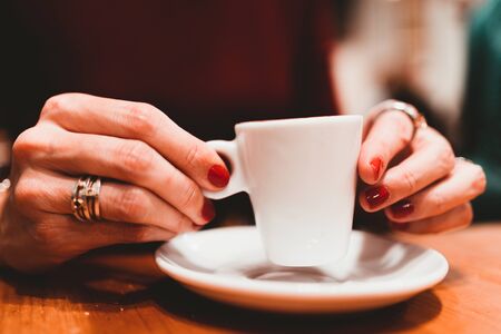 Girl sipping black coffee in cafe closup. Woman holding white cup of coffee outdoors. Good morning.