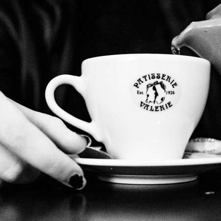 holding a latte in black and white