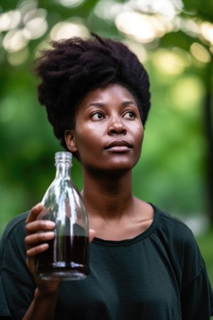 environmental, portrait and black woman with glass bottle on nature park for sustainability, created with generative ai