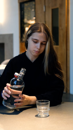 Pouring purified water from bottle onto living room table, providing ample space for text placement