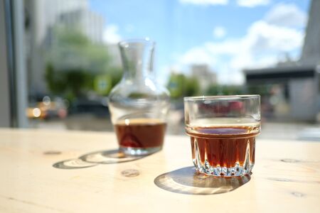 Drinking alternatively brewed coffee at the sunny street cafe from glasses. alternative brewing coffee concept