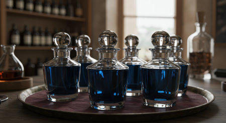 Multiple ornate glass bottles containing deep indigo liquid, topped with silver caps, are meticulously arranged on a round velvet tray, evoking luxury and craftsmanship.