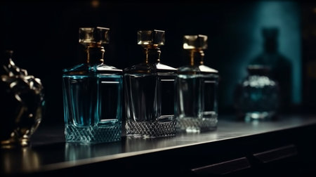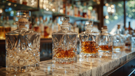 Elegant Display of Glass Bottles and Decanters Illuminated in Ambient Bar Setting
