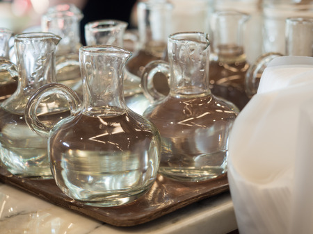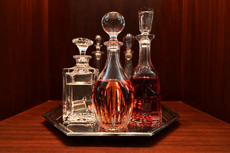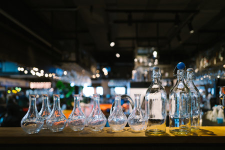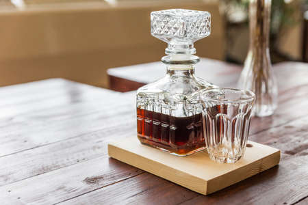 Glass decanters on the table in a restaurant. Selective focus.