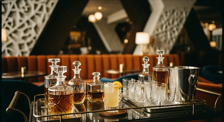 A luxurious bar setup with various bottles and glasses on a tray