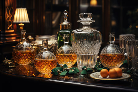 Close-up of a luxurious bar cart or sideboard featuring exquisite crystal decanters and cut-glass tumblers filled with amber spirits like whiskey or cognac. The scene is bathed in warm, sophisticated lighting, creating premium and opulent atmosphere