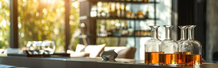 Luxurious bottles of whiskey displayed in a sunlit bar, highlighting their rich amber color. Ideal for themes related to beverages, luxury, and relaxation.