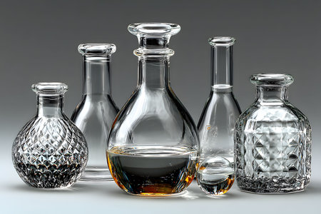 A sophisticated array of crystal decanters featuring various shapes, sizes, and textures against a soft gray background. ideal for enhancing home decor or elevating the aesthetic of a bar. the set showcases intricate design and clarity. Generative AI