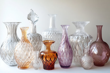 A collection of diverse glass vases exhibits artistic craftsmanship with different shapes and colors. Set against a minimalist background, these pieces highlight intricate patterns and textures that enhance their visual appeal.