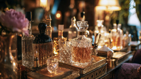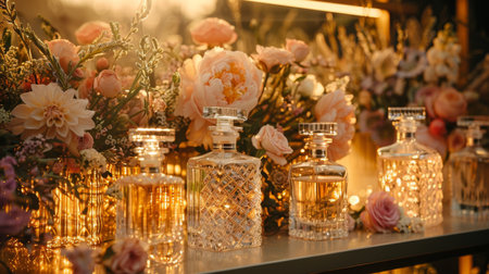 Elegant Display of Vintage Perfume Bottles Surrounded by Lush Floral Arrangements in a Softly Lit Setting at a Cozy Event Venue. Generative AI