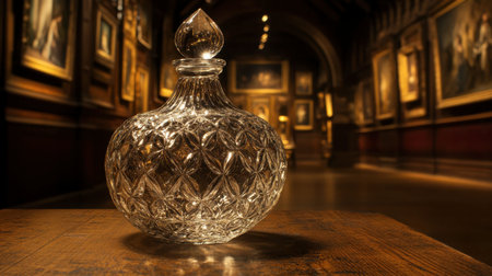 A beautifully crafted crystal decanter sits on a wooden table in an art gallery, showcasing intricate details and reflections in a warm, inviting atmosphere.