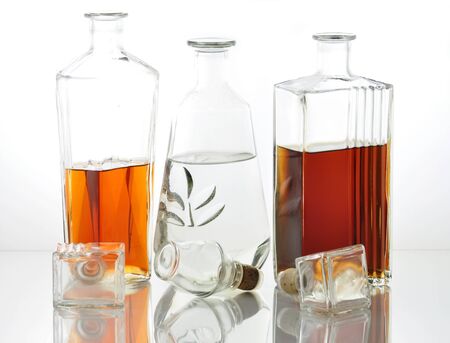 transparent decanter with water. vodka in a decanter. Vodka in a decanter and a glass on the table with a reflection. Antique glassware. Fragile item. Objects on an isolated white background.