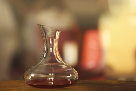 Glass carafe of red wine on blurred background