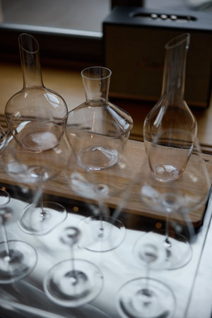 Clean wine glasses are on the table of a special wine cabinet, stylish table setting, ice, bottle of sparkling wine, light from window, decanter and degasser
