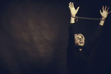 No freedom, social problems concept. Furious man with chained hands, studio shot on dark grunge background