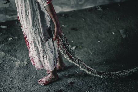 Horror ghost woman towing rope with resentment torture and ask for help blood in hand, Halloween murder concept.