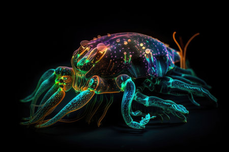 This vibrant photo captures a translucent crustacean with glowing patterns. Its intricate details against a dark backdrop highlight the beauty of marine life, ideal for biology and nature themes.
