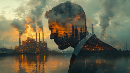 A vibrant sunset casts dark hues over an industrial skyline, filled with smoke and reflecting the impact of pollution. The scene captures an atmospheric contrast.