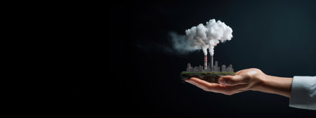 A hand holding a factory that smokes and pollutes the atmosphere. Ecological concept banner.