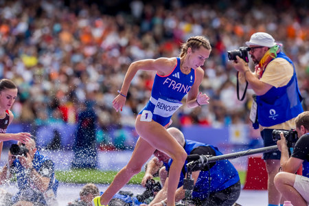 Flavie Renouard (FRA) of France, competes in the Women's 300m Steeplechase Round 1 at the Stade de France Stadium during the 2024 Paris Summer Olympics in Paris, France.