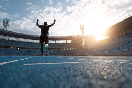 A silhouette of a runner with arms raised in triumph is captured on a blue track. The image showcases a stadium setting, the runner backlit by bright sunlight. The composition emphasizes action and success, with potential uses in sports, fitness, or motivational themes. The sky is partially cloudy.