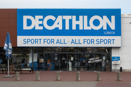 Luebeck, Germany, January 25, 2021: Decathlon logo sign over the entrance of their commercial store building, retail trade chain company with articles for sport and leisure activity