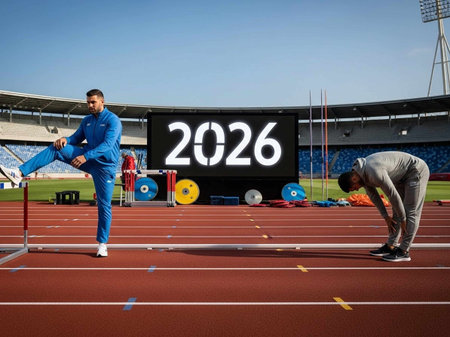 A runner stands with his back to the camera on an empty track, illuminated by bright stadium lights. The atmosphere is focused and intense, hinting at an upcoming race.
