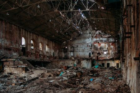 Old abandoned broken ruined industrial building interior.