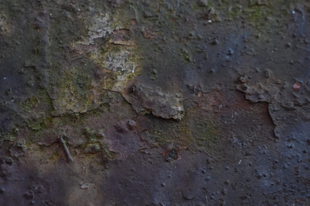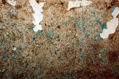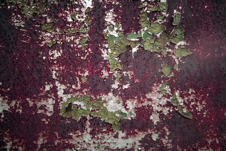 Rusty bumpy brown and purple textured background with green peeling paint with space for text.