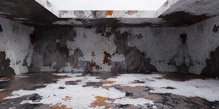 industrial rusty worn paint wall studio with open ceiling and sky day light 3d render illustration
