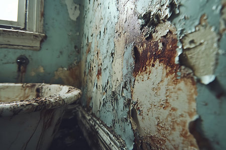 A neglected bathroom corner shows a vintage bathtub with a rusty interior and severely peeling paint on the walls. Natural light filters in through a nearby window.