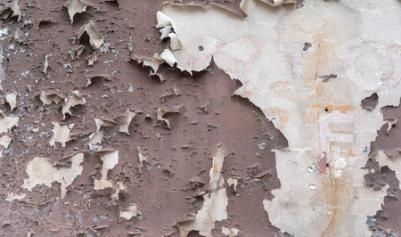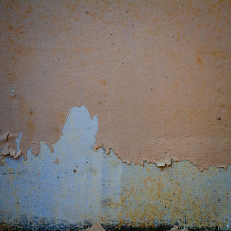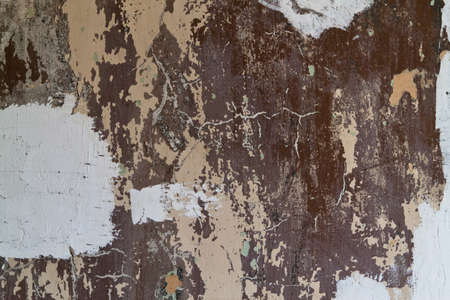 Destroyed shabby wall. Texture of cracked peeling plaster and paint. Facade of an abandoned building.