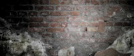 Old Brick Wall with Moss texture background. Old, decayed wall with peeling plaster.