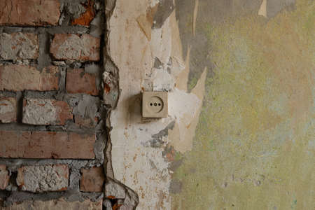 Old wall with a socket under renovation. Brickwork and old plaster without wallpaper. The textured background of a vintage wall. Abstract background with construction concept.