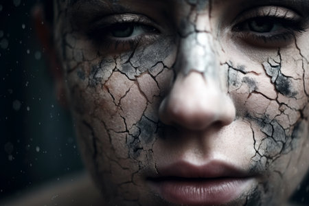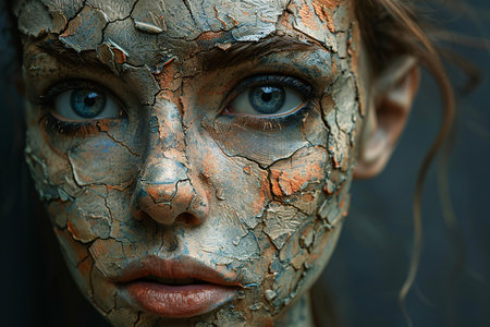 A young woman with striking blue eyes, her face adorned with cracked, textured paint resembling weathered earth.