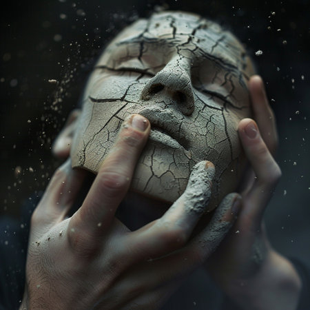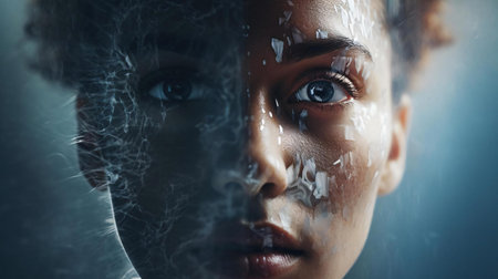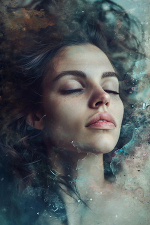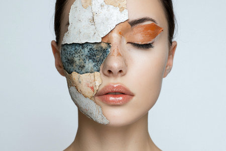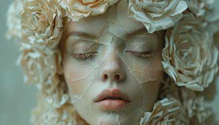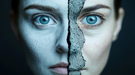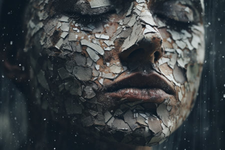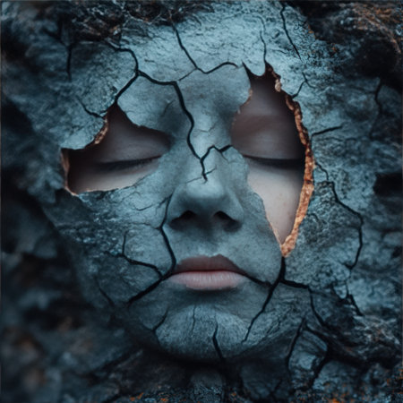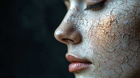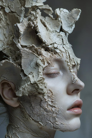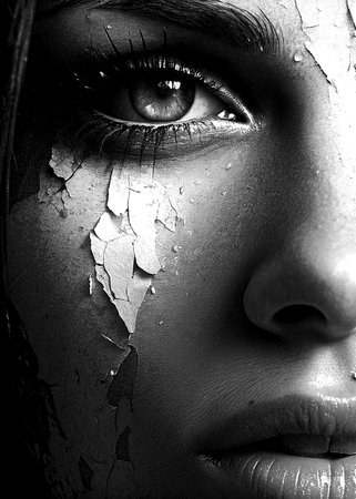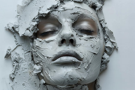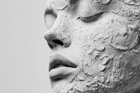 Artistic close-up of a serene womans face with textured plaster, showcasing beauty and tranquility. Black and white portrait emphasizing details and emotions.