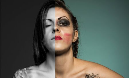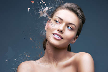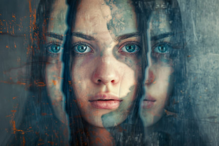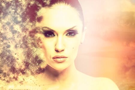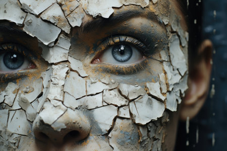 portrait of a beautiful girl with painted face on a rusty background. Surrealistic cracked art piece